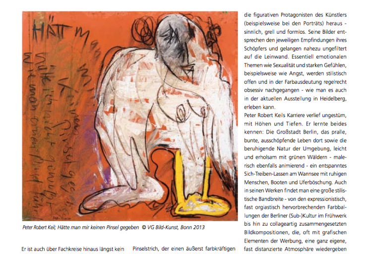 Am 30. Oktober war Start, in der vergangenen Woche wurde sie abgeschlossen: Die Zertifizierung der Werke Peter Robert Keils im Besitz der Heidelberger Keil Collection.In dem an dieser Stelle bereits beschriebenen Verfahren (Analyse vor Ort vor Zeugen) überprüfte der Künstler sämtliche Werke der Sammlung auf vielfältigen Dimensionen, wie z.B.