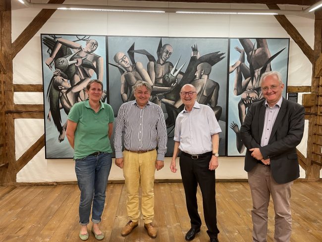 Die Galeristin Dr. Kristina Hoge (links), Wilhelm Kampik (links mittig) und Stephan Teuber (rechts) von der Keil-Collection Heidelberg stehen zusammen mit Manfred Heinrich (rechts mittig) vor dem Werk “Durch die Umerziehung der Vögel” des Künstlers Hans-Hendrik Grimmling. Im Rahmen des Jubiläumsjahr zum 80. Geburstag von Peter Robert Keil haben sich das Keil-Collection Team Heidelberg auf…