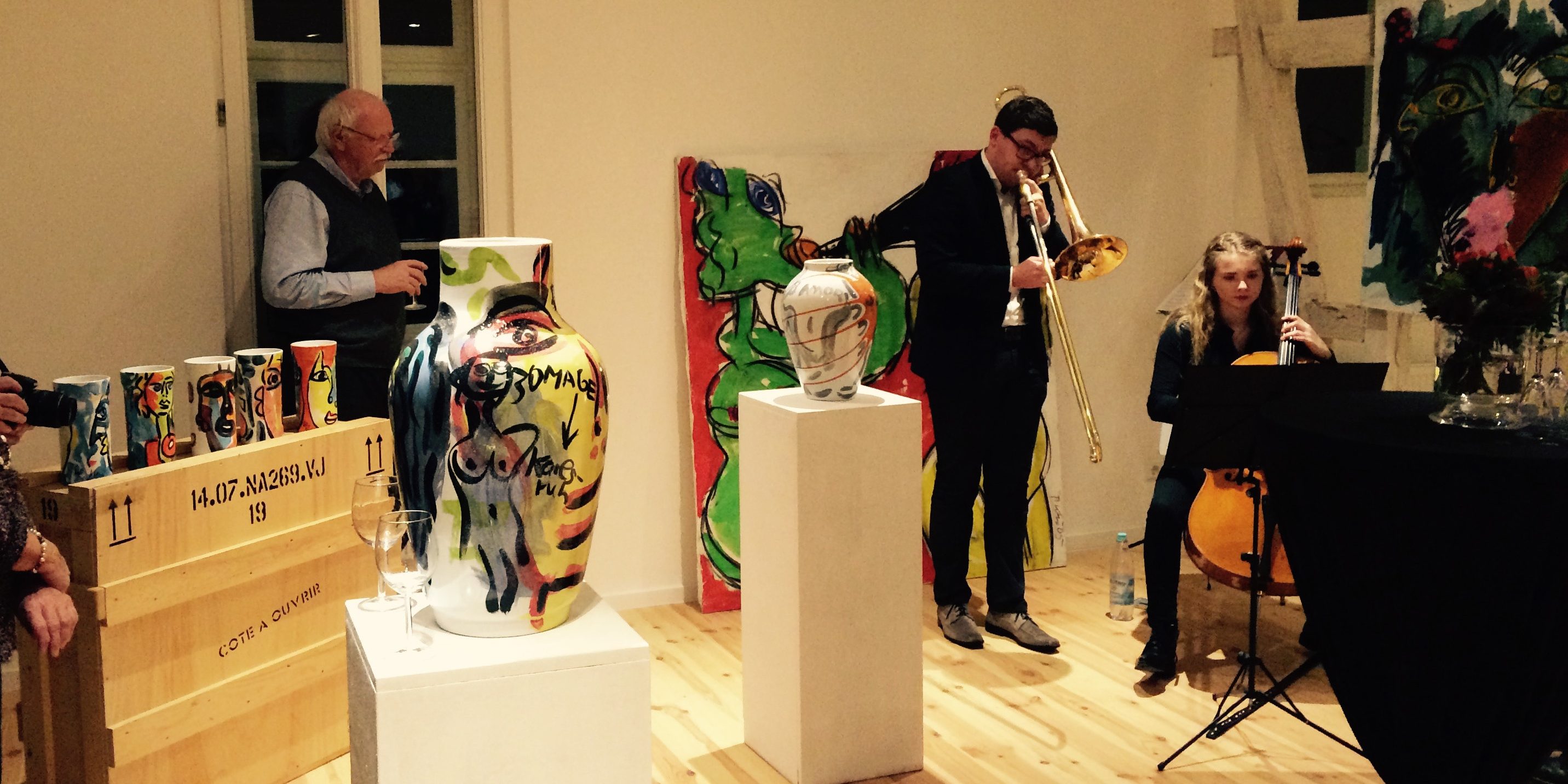 Schon hier kam es zu einer ersten Vereinigung der Künste, schaffte doch die famose musikalische Darbietung von Tabea Simonis am Cello und Mark Plaumbaum an der Posaune einen idealen Rahmen für den Kunstgenuss von Plastik, Skulptur und Malerei.